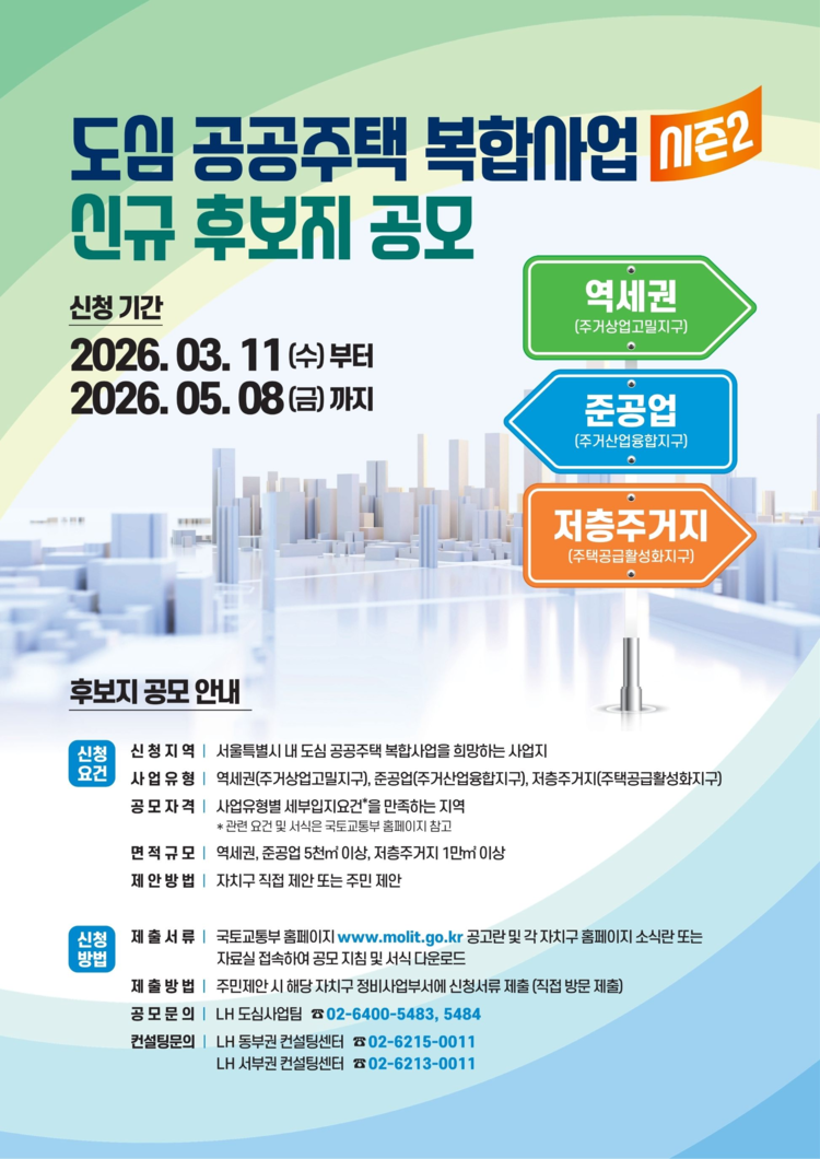 국토교통부는 도심 내 추가 주택 공급을 위해 도심 공공주택 복합사업(이하 도심복합사업) 신규 후보지 공모를 오는 11일부터 실시한다고 10일 밝혔다.