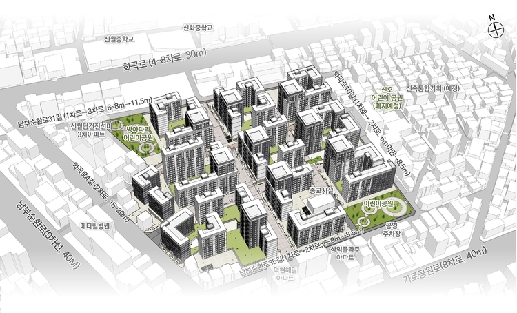LH는 인접한 신월5동 72번지 재개발 구역과 연계되는 동서 방향의 공공 보행통로를 설치하고, 통로 주변에는 돌봄 시설과 고령자 전용 시설 등 커뮤니티 공간을 배치해 지역 개방성을 높일 계획이다.