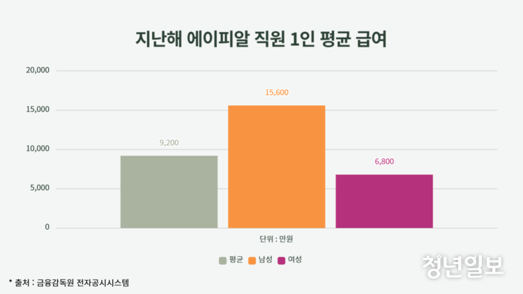 성별로 보면 남성 직원의 평균 연봉은 1억5천600만원, 여성 직원은 6천800만원으로 남성이 두 배 이상 높은 것으로 나타났다.