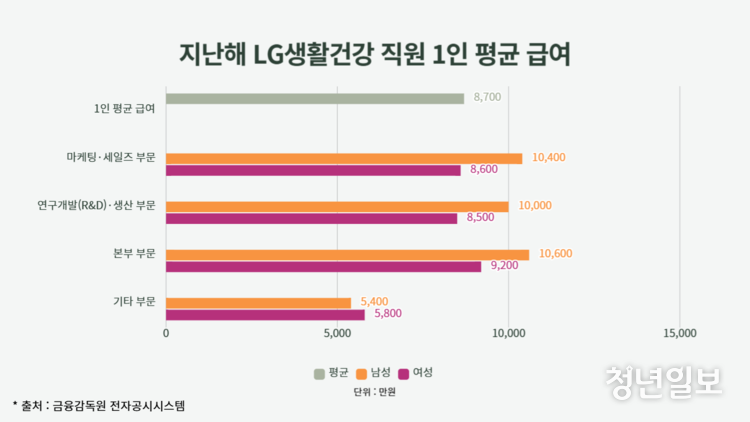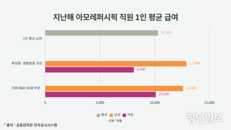 부문별 연봉을 살펴보면, 화장품·생활용품 부문 남성 1인 평균 급여액은 1억2천900만원, 여성은 8천100만원으로 남성이 4천800만원 더 많았다. 평균 근속연수는 남성이 14년, 여성이 13년이었다.
