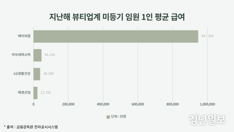아모레퍼시픽(48명), LG생활건강(36명), 에이피알(4명), 애경산업(6명)은 미등기임원이 포함된 기준으로 평균 급여가 집계된 반면, 한국콜마와 코스맥스는 해당 인원이 제외된 수치가 반영됐다.