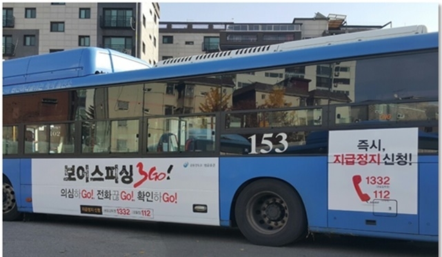 먼저, 버스의 경우 차도·인도면 및 후면 등 3개 면에 피해예방 요령을 담은 슬고건과 주의 문구를 부착한다. 슬로건은 ‘보이스피싱 3Go, 의심하고! 전화끊고! 확인하고’이며 주의 문구는 ‘보이스피싱, 당신도 피해자가 될 수 있습니다’로 정해졌다.
