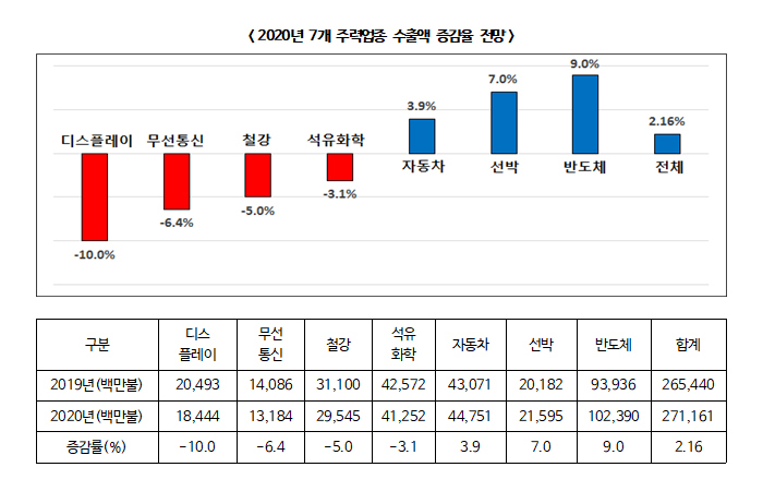 업종별로는 반도체(9.0%), 선박(7.0%), 자동차(3.9%) 업종의 수출액이 증가하고 디스플레이(-10.0%), 무선통신기기(-6.4%), 철강(-5.0), 석유화학(-3.1%) 업종은 감소할 것으로 나타났다.