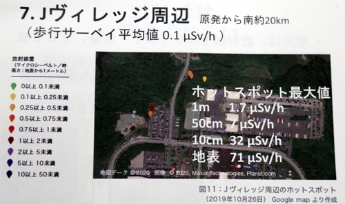 J빌리지 인근 핫스폿의 경우 지면에서 10㎝ 높이는 32μ㏜, 50㎝ 높이는 7μ㏜, 1m 높이는 1.7μ㏜였고, 스포츠 운동 시설인 아즈마 구장 옆을 지나는 도로변 인근에서 핫스폿이 발견됐다.