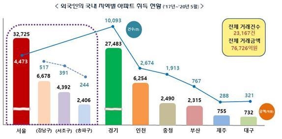 국세청에 따르면 2017년부터 올해 5월까지 외국인 2만3219명이 국내 아파트 2만3167채를 취득해 거래 금액이 7조6726억원이었다.
