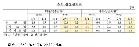 다른 성장성 지표인 총자산 증가율 평균(1.9%)도 2분기(1.1%)보다 높아졌다. 수익성 지표를 봐도 매출액영업이익률(6%)과 매출액 세전 순이익률(5.6%) 모두 2분기(5.3%·5.2%)를 웃돌았다. 지난해 3분기(4.7%·4.9%)보다도 높은 수준이다.