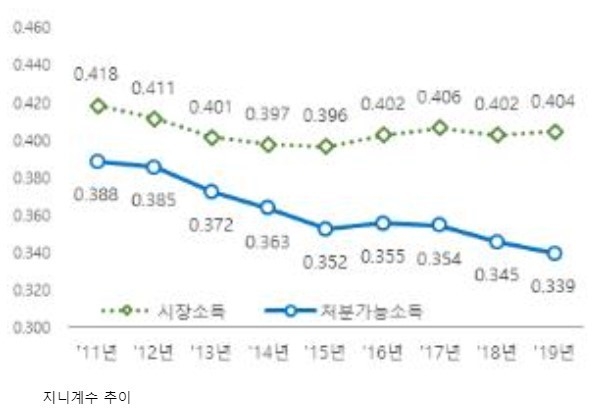 처분가능소득 기준 지니계수는 지난 2011년 0.388, 2012년 0.385, 2013년 0.372, 2014년 0.363, 2015년 0.352 등으로 낮아지다가 2016년 0.355로 조금 올랐다. 이후 지난 2017년 0.354, 2018년 0.345에 이어 지난해까지 3년 연속 하락했다.