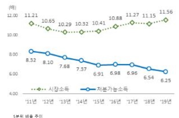소득 5분위 배율은 소득 상위 20% 계층의 평균소득을 하위 20% 계층의 평균소득으로 나눈 것으로, 숫자가 낮을수록 소득분배가 균등한 것으로 해석된다.