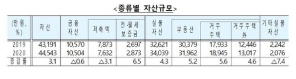 올해 3월말 기준 가구의 평균 자산은 4억4천543만원으로 1년 전보다 3.1% 늘었다. 거주 주택 가격이 상승한 영향으로 실물자산(3억4천39만원)은 4.3%로 더 큰 폭으로 늘었다. 전체 자산 중 실물자산은 76.4%로, 비중이 0.9%포인트 늘어났다.