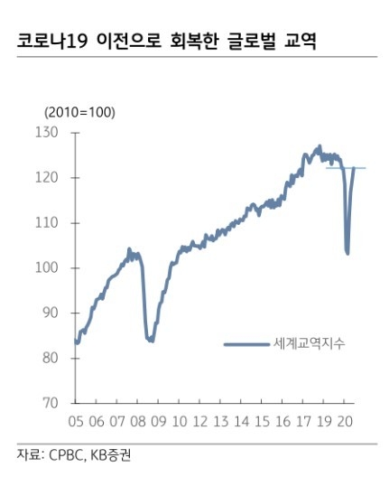 김효진 KB증권 연구원은 지난 24일 보고서로 "CPB(네덜란드 경제정책국)는 9월 글로벌 교역지수가 코로나19 본격화 이전인 2020년 2월 수준으로 회복했다고 밝혔다"라며 "코로나19 이전 수준을 넘어서는 글로벌 교역 회복이 진행된 것으로 추정된다"고 밝혔다.