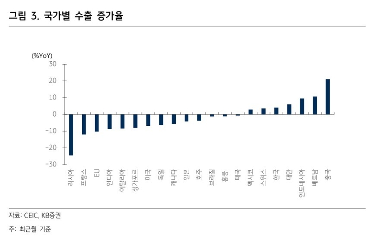 김 연구원은 국가 간 회복세 격차가 축소되는 것에 주목할 만하다고 설명했다. 앞서 KB증권은 코로나19 이후 국가 간 회복세를 국가별로 불균형적 회복을 보인다는 점에서 '불균형한 경기 회복'이라고 정의한 바 있다. 불균형한 경기 회복이 지속될 것이라는 점에는 이견이 없으나 다만 교역에서 회복을 보이는 국가가 늘어나고 있다고 김 연구원은 판단했다.