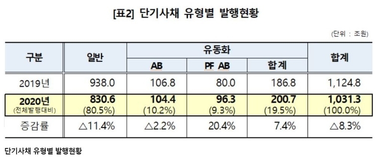초단기물은 636조9천억원이 발행돼 전년(728조6천억원)보다 12.6%가 줄었다. 종류별로 보면 일반 단기사채가 전년(938조원)보다 11.4% 감소한 830조6천억원 규모였다. 특수목적회사(SPC)나 프로젝트파이낸싱(PF) 등이 발행하는 유동화 단기사채는 200조7천억원으로 전년(186조8천억원) 대비 7.4% 늘었다.