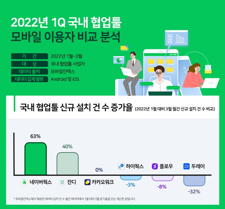 빅데이터 분석 플랫폼 모바일인덱스가 국내 업무용 협업 도구 6개 사(네이버웍스·잔디·카카오워크·하이웍스·플로우·두레이)를 비교한 2022년 1분기 ‘국내 협업 툴 모바일 이용자 분석’에 따르면, 올해 1월 대비 3월 월간 신규 설치 증가율 항목에서 네이버웍스가 63%로 가장 높은 수치를 기록했다.