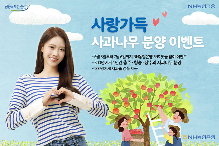 【 청년일보 】 NH농협은행은 농업인이 키워주고 고객들이 직접 수확할 수 있는 '사과나무 분양 이벤트'를 7월 6일까지 공식 SNS에서 실시한다고 8일 밝혔다.