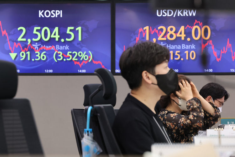 13일 한국거래소에 따르면 코스피는 전 거래일보다 91.36포인트(3.52%) 내린 2,504.51에 장을 마쳤다. 지수는 지난 10일(현지시간) 발표된 미국 물가 충격 여파로 전장보다 45.66포인트(1.76%) 하락한 2,550.21에 개장해 장 초반부터 급락했다.