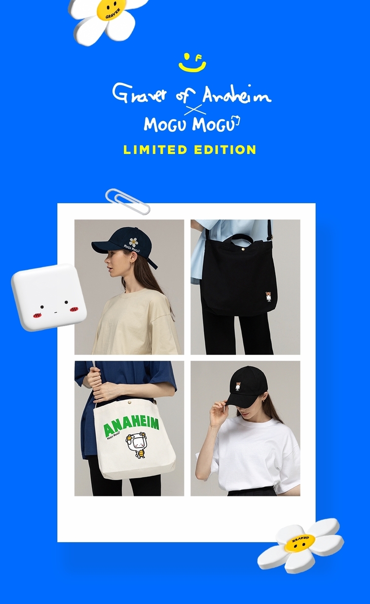 콜라보레이션 라인업은 티셔츠, 에코백, 캡 모자 각각 2가지 디자인과 2가지 컬러로 공개되었으며, 모구모구 시그니처 캐릭터와 그레이버 시그니처 핸드드로잉 곰과 꽃 로고가 메인이다.