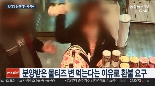 이에 여성은 강아지를 데리고 온 가방에서 강아지를 한 손으로 꺼내 움켜진 뒤 주인을 향해 던졌다.