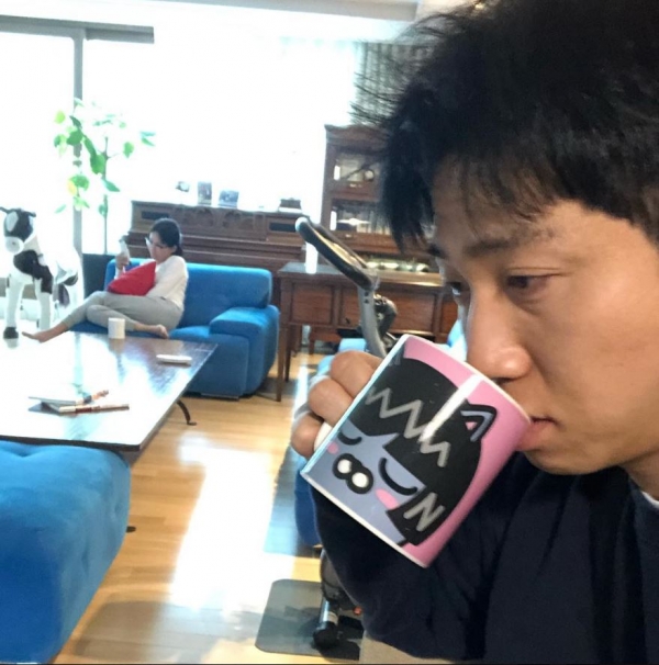 공개된 사진 속 유세윤은 고양이 캐릭터가 그려진 머그잔을 들고 부스스한 얼굴로 뭔가를 마시고 있다.