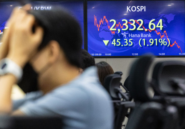 30일 한국거래소에 따르면 코스피는 전 거래일보다 45.35포인트(1.91%) 하락한 2,332.64에 장을 마쳤다. 지수는 전장보다 9.42포인트(0.40%) 내린 2,368.57로 개장해 장중 낙폭을 키웠다.