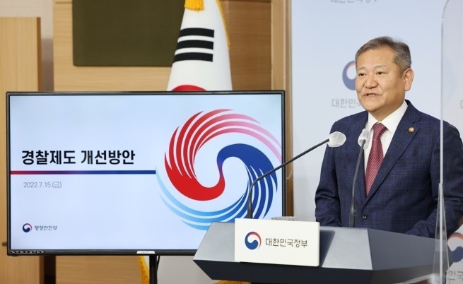 이상민 행안부 장관은 15일 정부서울청사에서 브리핑을 열고 행안부 내에 치안감을 부서장으로 하는 '경찰국'을 신설하고 소속청장 지휘규칙을 제정하겠다고 공식 발표.
