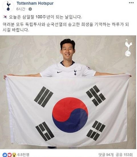 그는 1일 토트넘 페이스북 계정을 통해 "오늘은 삼일절 100주년이 되는 날"이라는 글과 함께 사진을 올렸다.