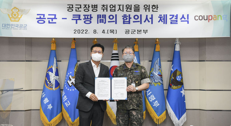 쿠팡과 공군은 전역을 앞둔 장병의 취업 부담을 덜어주고, 군 출신 우수인재 추천 및 채용을 진행하기 위해 이번 협력을 추진한다. 협약식에는 노재국 쿠팡 전무와 김영채 공군 인사참모부장(소장) 등 행사 관계자들이 참석해 장병들의 취업 지원에 힘쓸 것을 약속했다.