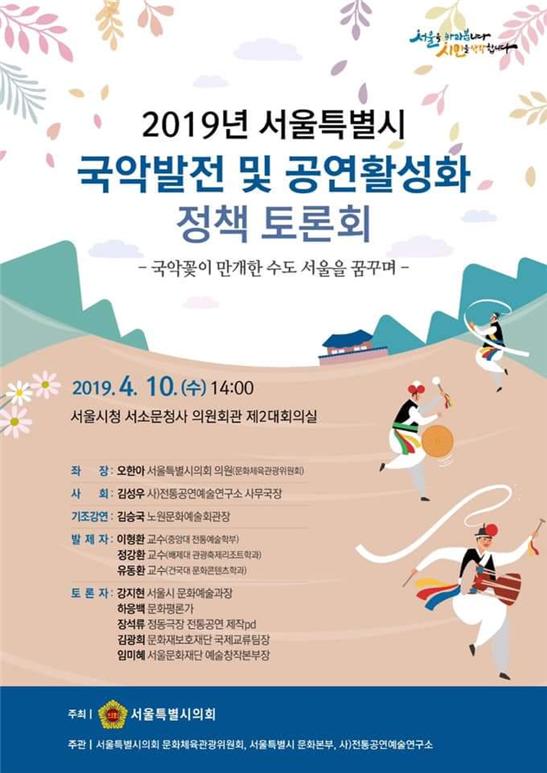 4월 10일 오후 2시부터 5시까지 서울시의원회관 2층 제1 대회의실에서 ‘서울특별시 국악발전 및 국악공연활성화 방안 모색’이라는 주제와 ‘국악꽃이 만개한 수도 서울을 꿈꾸며’를 부제로 학계, 전통공연예술계, 서울시 관계자들이 함께 모여 정책토론회를 갖는다.