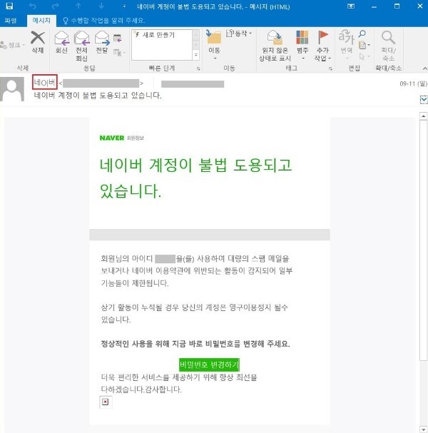 이메일을 열면 "회원님의 아이디를 사용해 대량의 스팸 메일을 보내거나 네이버 이용 약관에 위반되는 활동이 감지돼 일부 기능들이 제한된다"면서 '비밀번호 변경하기' 버튼의 클릭을 유도하고 있다.