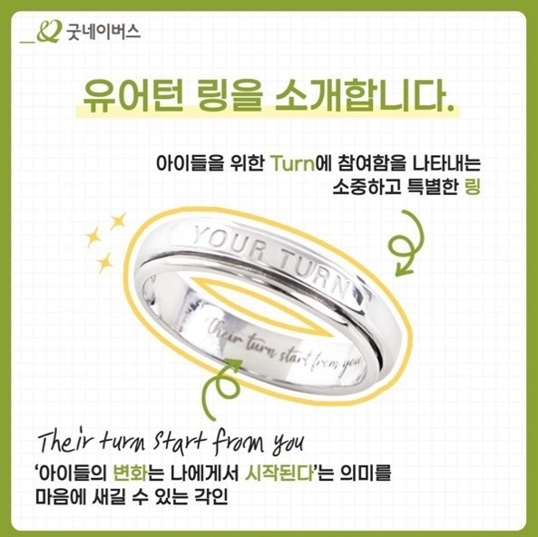 굿네이버스의 유어턴 링은 ‘아이들을 위한 터닝포인트’라는 주제를 가지고 제작된 캠페인으로, 보건의료지원사업에 월 2만원 이상 정기후원 시에 받을 수 있다. 발송 시기는 첫 후원금 납입 후 주내 발송되며, 유어턴 캠페인의 경우 월 2만원 이상 정기후원 참여 1회당 유어턴링 1개가 전달된다.