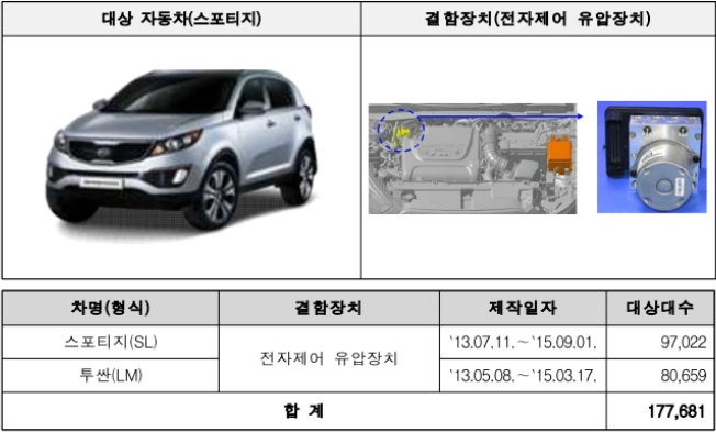 현대자동차·기아에서 제작·판매한 스포티지 등 2개 차종 17만7천681대는 전자제어 유압장치(HECU)의 내부 합선에 의해 화재가 발생할 가능성이 확인됐다.