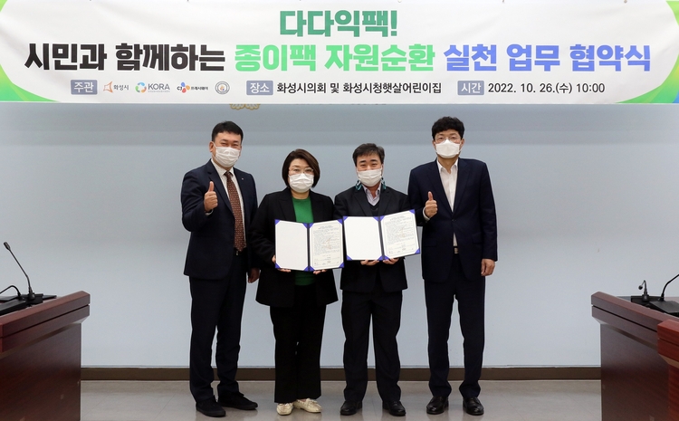 CJ프레시웨이는 26일 화성시의회에서 화성시, 한국순환자원유통지원센터, 화성시어린이집연합회 관계자가 한자리에 모여 종이팩 자원순환 캠페인 ‘다다익팩’의 시작을 알리는 업무협약식을 진행했다고 27일 밝혔다.