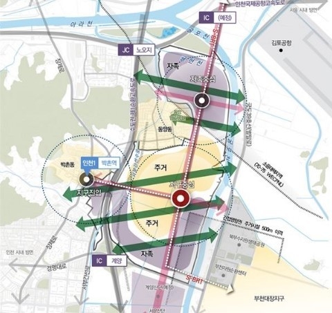 S-BRT(간선급행버스체계) 등 교통 결절점에 위치한 중심거점지역은 주거·상업·자족 시설과 녹지가 어우러진 복합단지로 기획해 인천계양 신도시의 랜드마크로 만든다.