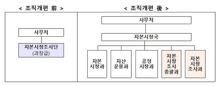 기존에는 자본시장조사 업무를 자본시장조사단(과장급)에서 전담했으나, 앞으로는 자본시장조사총괄과와 자본시장조사과 2개 부서로 확대해 업무에 대응하기로 했다.