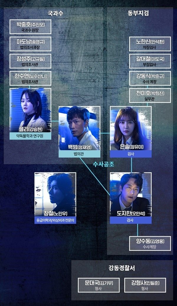 '검법남녀 시즌2' 인물관계도는 크게 국과수와 동부지검의 인물들로 나뉘며 강동경찰서가 그 주변에 놓여 있다.