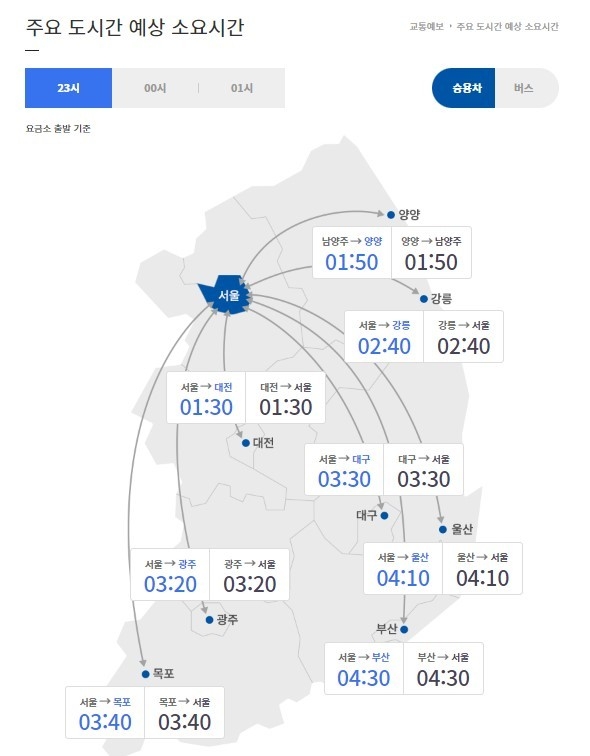 오후 10시 기준으로 서울 요금소를 출발해 전국 주요 도시까지 걸리는 예상 시간은 부산 4시간 30분, 울산 4시간 10분, 대구 3시간 30분, 광주 3시간 20분, 강릉 2시간 40분, 대전 1시간 30분이다.