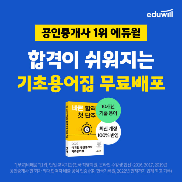 【 청년일보 】 종합교육기업 에듀윌은 올해 공인중개사 수험생을 대상으로 '기초용어집'을 선착순 무료로 증정한다고 9일 밝혔다.