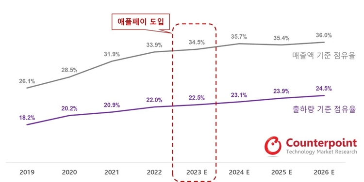 이윤정 카운터포인트 연구위원은 "물론 장기적으로 한국 스마트폰 시장내 애플의 점유율은 과거 대비 젊은 세대의 브랜드 인지도가 높아짐에 따라 점진 확대될 것으로 예상되고 있으나, 이는 애플페이 도입과는 별개의 사안으로 보아야 한다"고 언급했다.