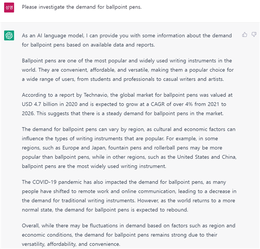 이 뿐만이 아니다. ChatGPT는 데이터 접근과 정리에도 능한데, ChatGPT에 볼펜의 수요에 대해 조사해 달라고 명령했더니, [사진 2]와 같은 대답을 했다.