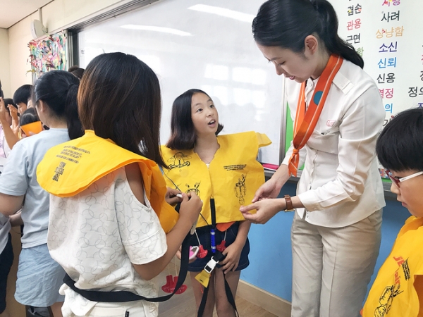 이날 진행한 항공안전체험교실에는 5명의 제주항공 객실승무원이 강사로 나서 ▲구명복 착용방법 ▲산소마스크 이용법 ▲좌석벨트 착용방법 등에 대한 체험교육과 항공기에서의 객실승무원의 역할과 승무원의 꿈을 이루기 위해 필요한 것들 것 대한 질의응답 등을 통한 진로교육도 실시했다.