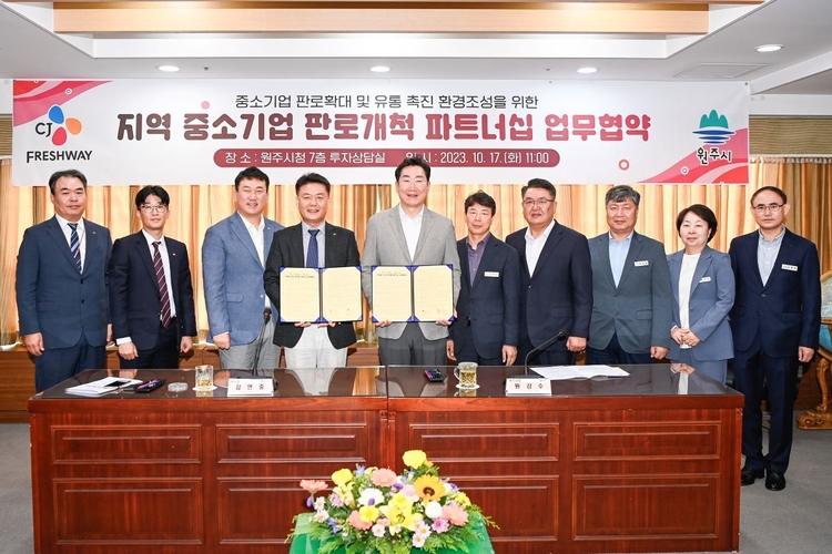 이날 CJ프레시웨이는 원주시청에서 강연중 부사장, 원강수 원주시장 등 주요 관계자들이 참석한 가운데 지역 중소기업의 우수제품 발굴 육성 및 판로 확대 지원 등 상생발전을 위해 상호협력키로 했다.