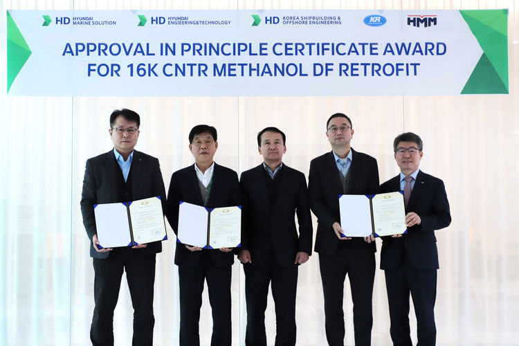 HD현대마린솔루션은 최근 한국선급(KR), HD한국조선해양, HD현대이엔티와 '공동개발 프로젝트' 형식으로 수행한 '메탄올 이중연료 추진 개조 설계'가 한국선급으로부터 기본 인증을 획득했다고 25일 밝혔다.