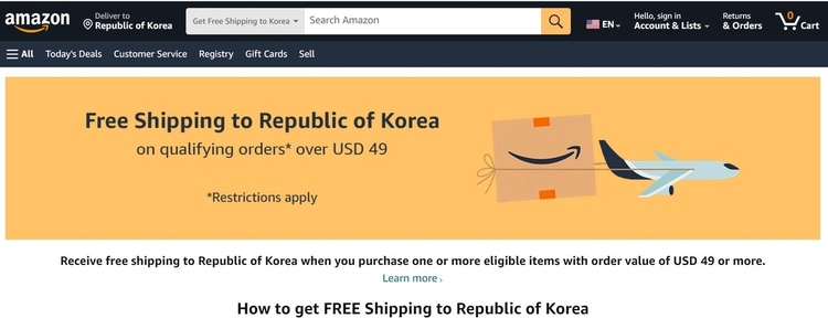 이날 업계에 따르면 아마존은 모바일 애플리케이션(앱)과 홈페이지 첫 화면에 한국으로의 무료배송 프로모션 문구를 노출하고 있다. 총 결제금액 49달러(약 6만8천원) 이상일 때 적용되며, 일부 품목으로 제한된다는 내용이다.