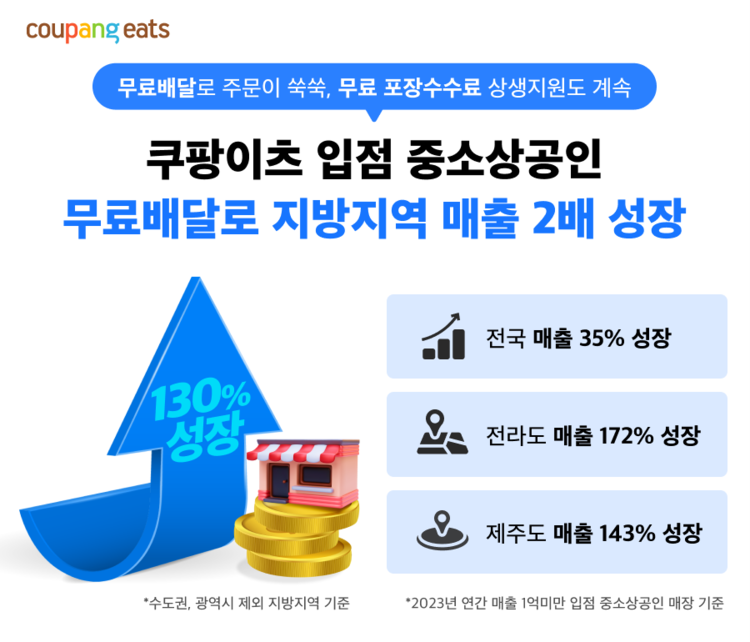 쿠팡이츠가 고객 배달비를 전액 지원하는 무료배달 와우혜택을 시행한지 1개월만에 입점 중소상공인 매출은 지방지역이 2배 이상 올라 큰 폭의 성장세를 기록했으며 전체 매장도 35% 상승세를 보였다고 설명했다.