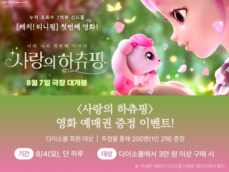이번 이벤트는 오는 4일 하루동안 참여 가능하며, 다이소몰에서 3만원 이상 구매 시 추첨을 통해 '사랑의 하츄핑' 영화 예매권을 증정한다.