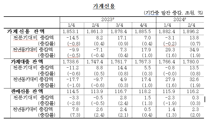 이는 1분기 말(1천882조4천억원)에서 13조8천억원 증가한 수치로, 지난 2002년 4분기 이후 가장 큰 규모다.