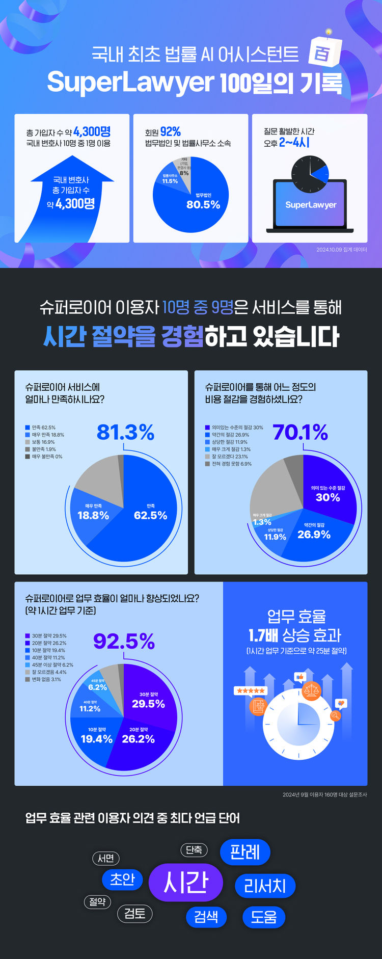 슈퍼로이어는 출시 후 빠르게 가입자를 확보했다. 9일 기준, 출시 100일 만에 약 4천300명의 가입자를 확보했다. 이는 국내 전체 변호사 수 3만5천938명(2024년 9월 기준)의 약 12%에 달한다.