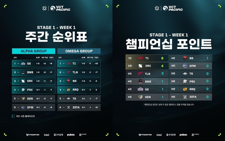 VCT 퍼시픽에 참가하고 있는 네 개의 한국팀 가운데 젠지를 제외한 DRX와 T1, 농심 레드포스가 승리를 따내면서 깔끔하게 스타트를 끊었다.