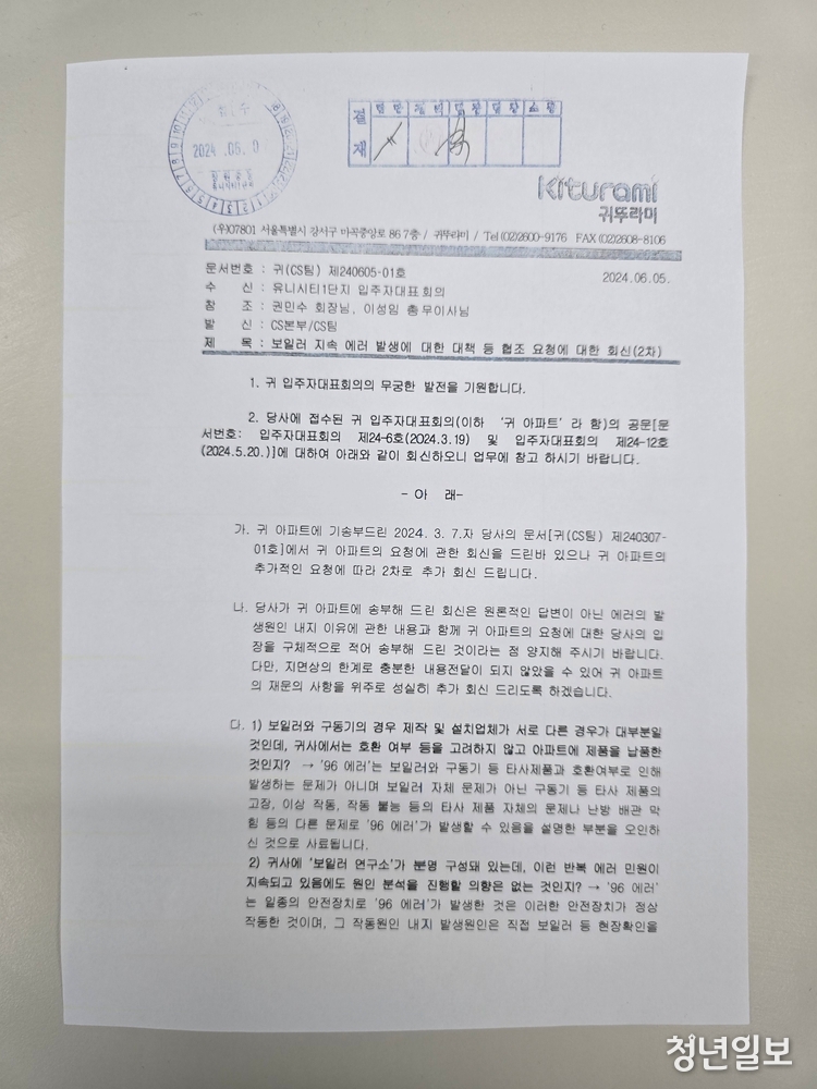 이처럼 문제가 심각하다고 판단한 입주자대표회의는 단지 내 절반 이상의 세대가 보일러의 잦은 에러 발생으로 불편을 야기하고, 비용이 발생하는 등 입주민들의 피해가 반복되고 있다는 점이 확인된 만큼 조사 결과 내용을 담은 공문을 귀뚜라미 보일러 측에 세차례(2024년 1월31일, 3월 19일, 5월 20일)에 걸쳐 발송했다.
