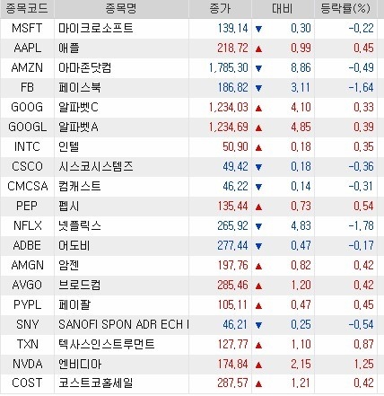 스탠더드앤드푸어스(S&P) 500 지수는 전장보다 0.29포인트(0.01%) 하락한 2,991.78에, 기술주 중심의 나스닥 지수는 5.21포인트(0.06%) 내린 8,112.46에 장을 마감했다.