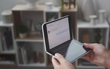 글자를 입력할 때는 트랙패드까지 딸린 물리 키보드가 튀어나오게 할 수 있다. 이런 기능을 구현하기 위해 새로 개발된 윈도 10X가 OS로 탑재된다.